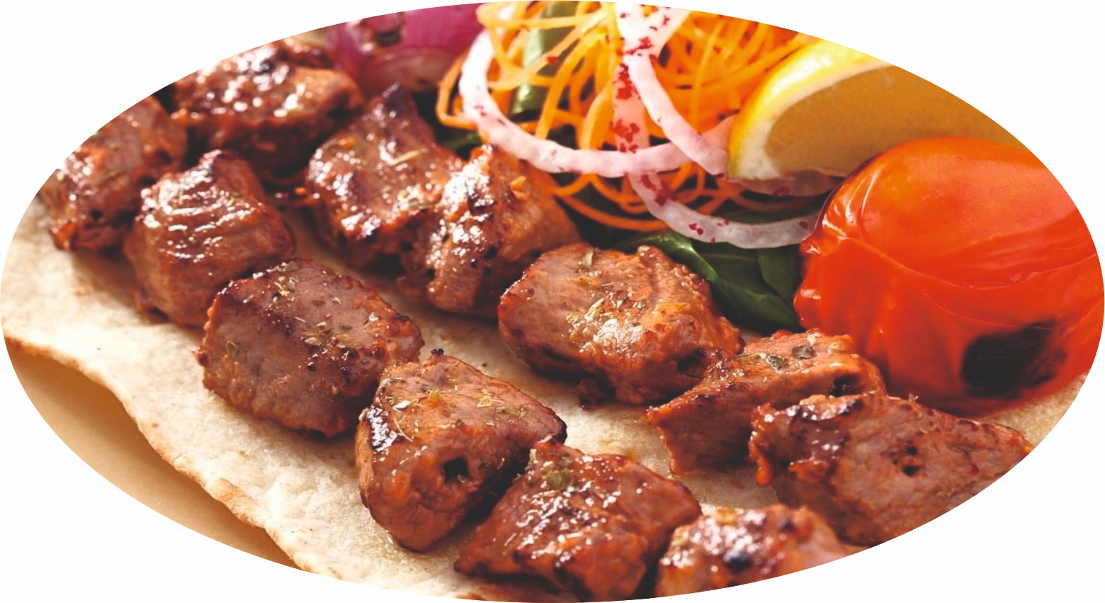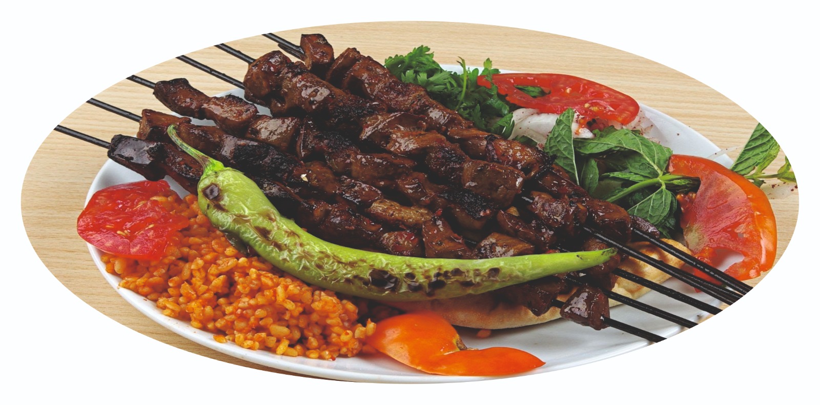 Odun ateşinde pişirilmiş kuşbaşı et parçaları, közlenmiş sebzeler ve taptaze garnitürlerle servis edilir.