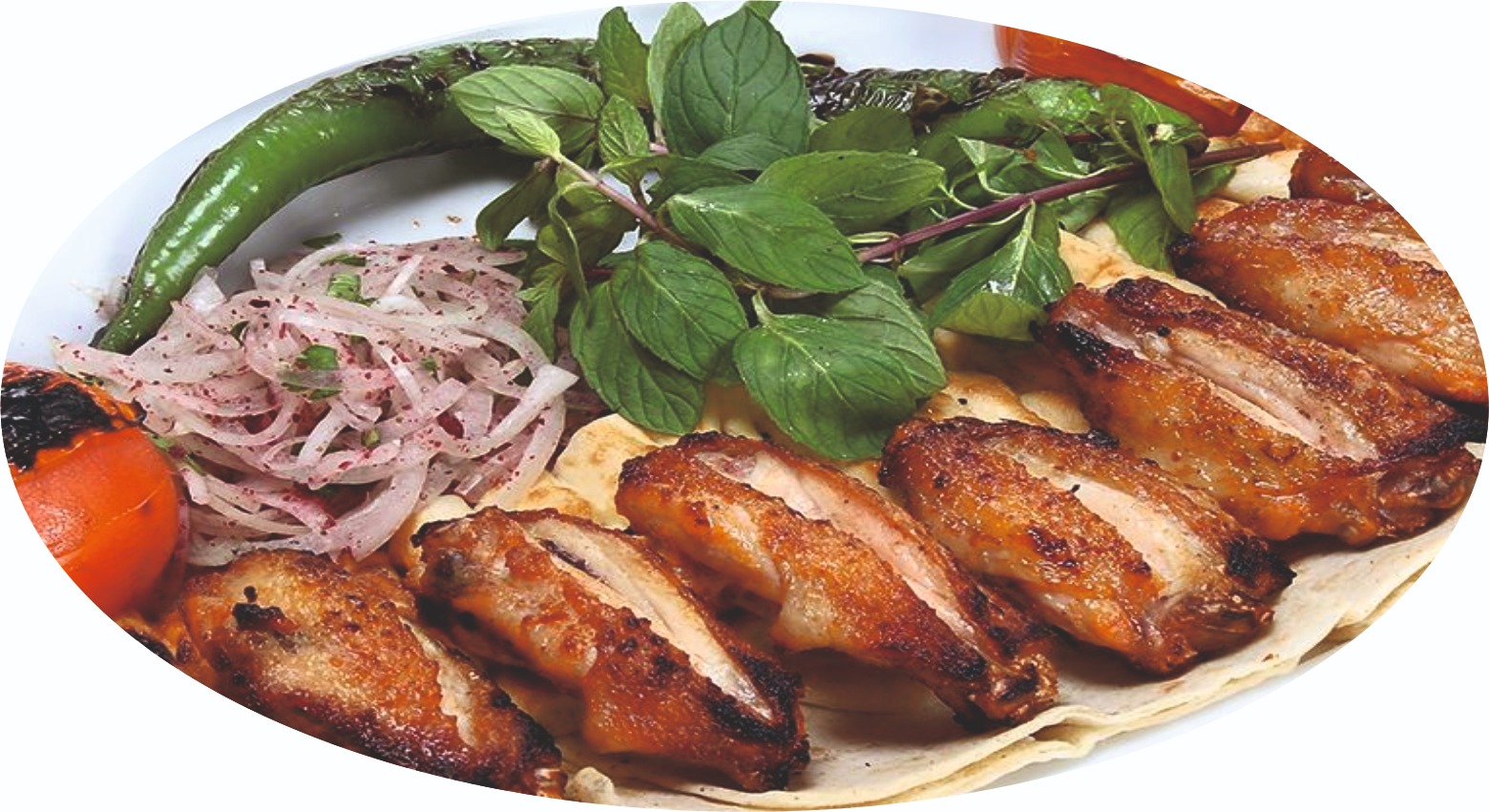 Marine edilmiş tavuk parçaları, şişe dizilerek ızgarada pişirilir. Yanında közlenmiş sebzeler ve taze garnitürlerle sunulur.